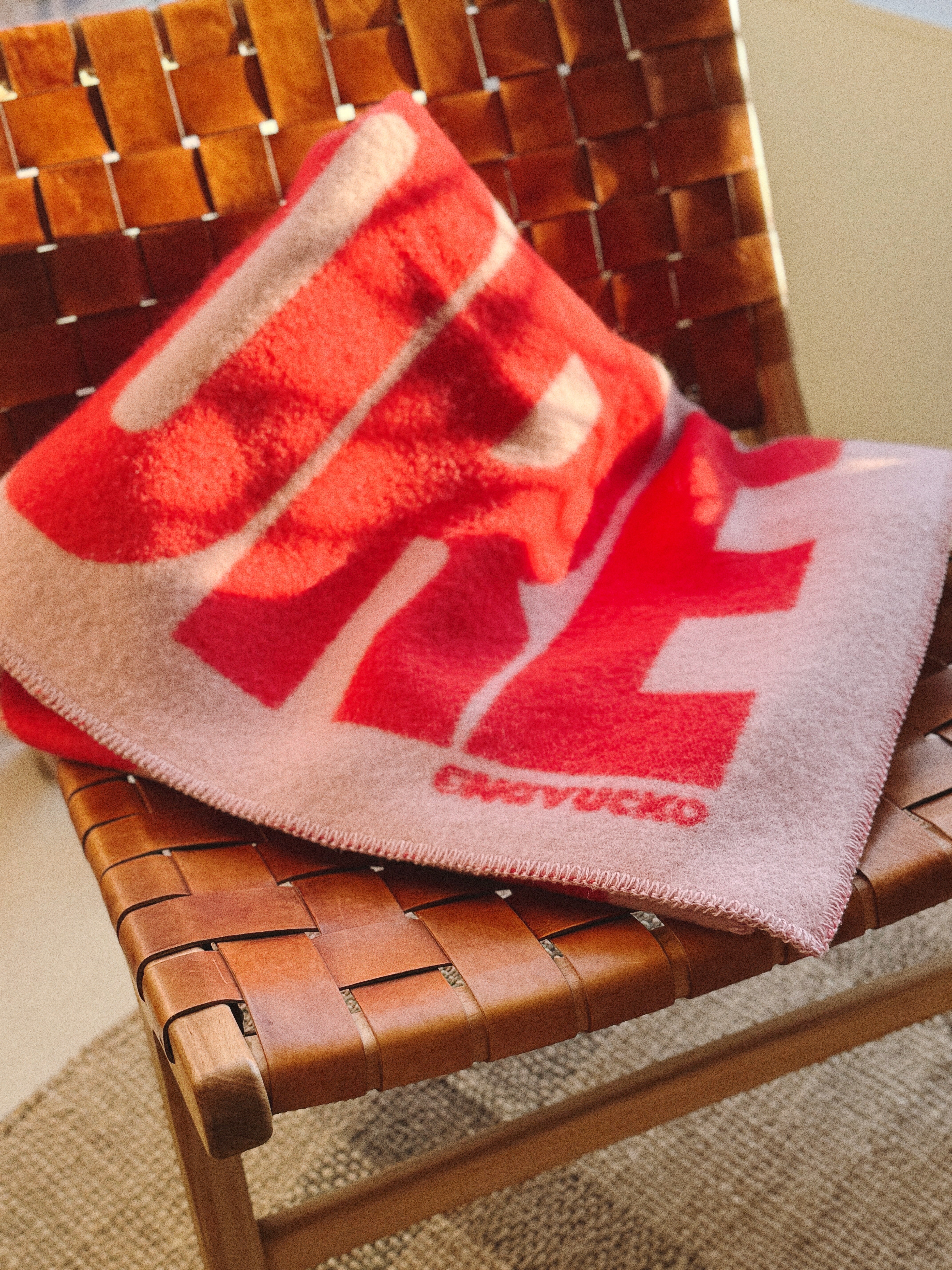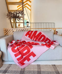 Kuschelige Woll-Decke mit dem Design "AMORE" in der Farbkombi Rosa/Rot.