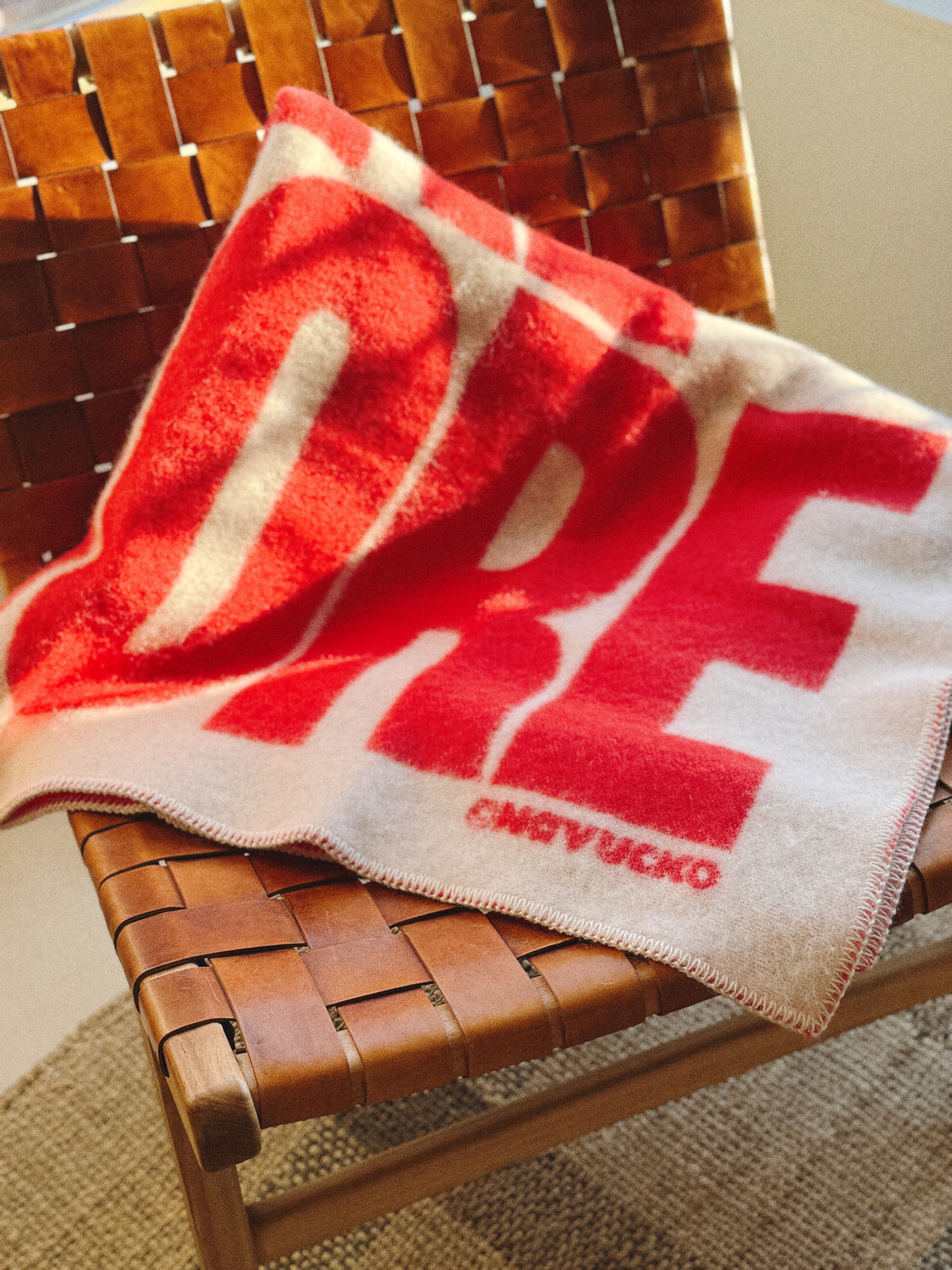 Kuschelige Woll-Decke mit dem Design "AMORE" in der Farbkombi Weiß/Rot.