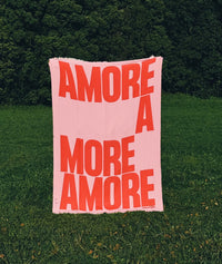 Weiche Baumwoll-Decke mit dem Design "AMORE" in der Farbkombi Rosa/Rot.