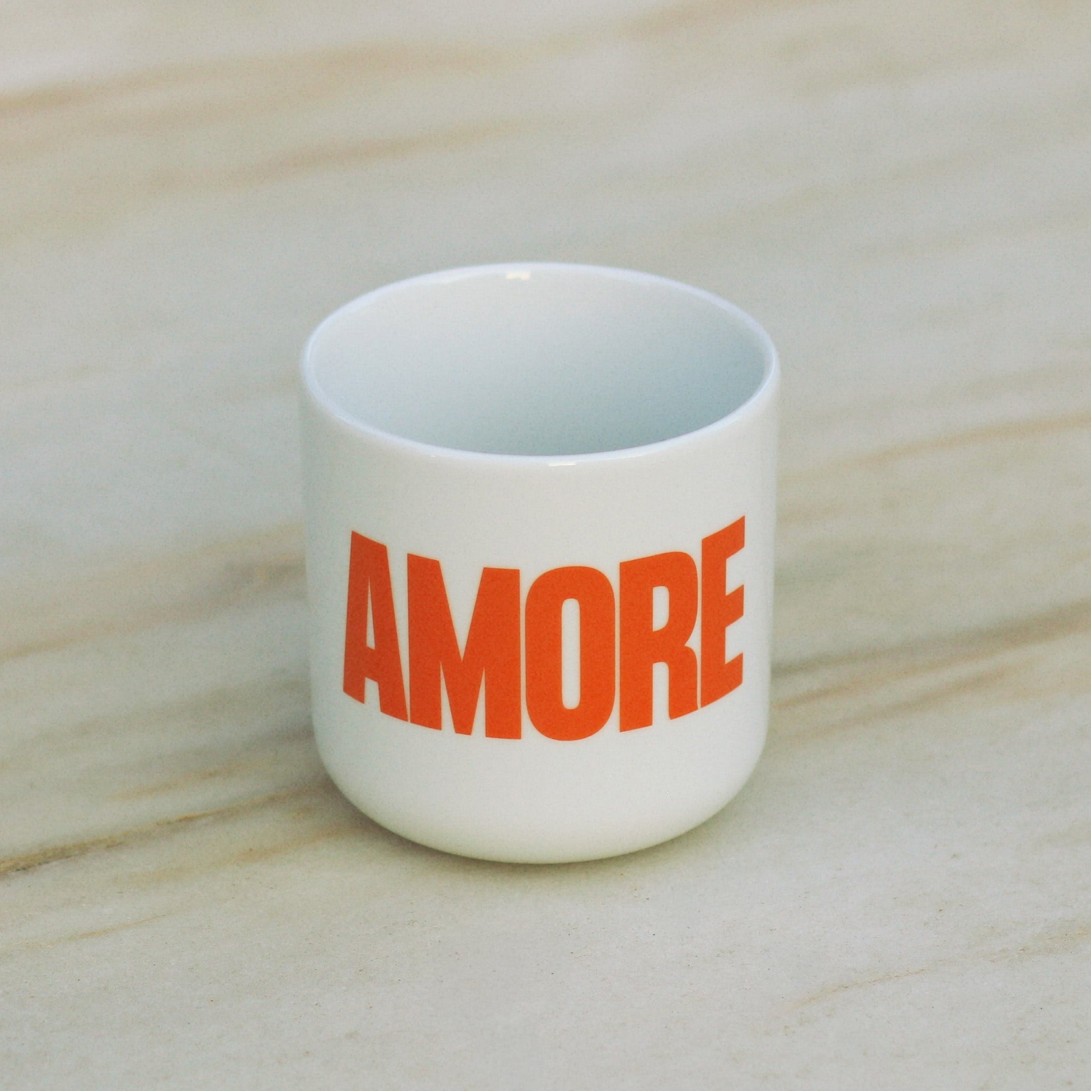 Beautiful handy mug made of porcelain (handleless) with the motif AMORE.
